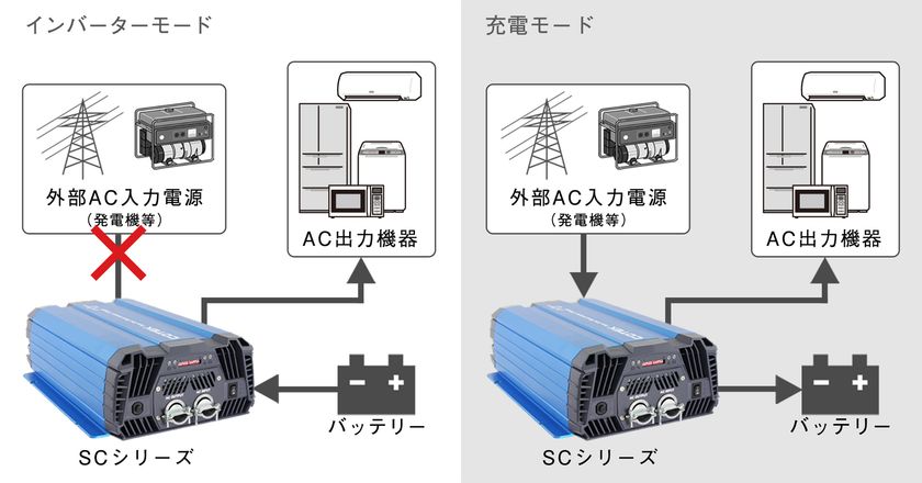 『SCシリーズ』は、正弦波インバーター「SPシリーズ」の基本機能はそのままに、バッテリーチャージャーを内蔵した充電器内蔵型インバーターです。