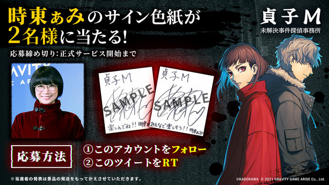 グラビティゲームアライズ株式会社(所在地:東京都中央区)は、スマートフォン・タブレット向け謎解きホラー脱出アドベンチャーゲーム「貞子M 未解決事件探偵事務所」の今秋リリースを記念して、本日より人気タレント「時東ぁみ」さんのサイン色紙が当たるTwitterフォロー&リツイートキャンペーンを開始しました。