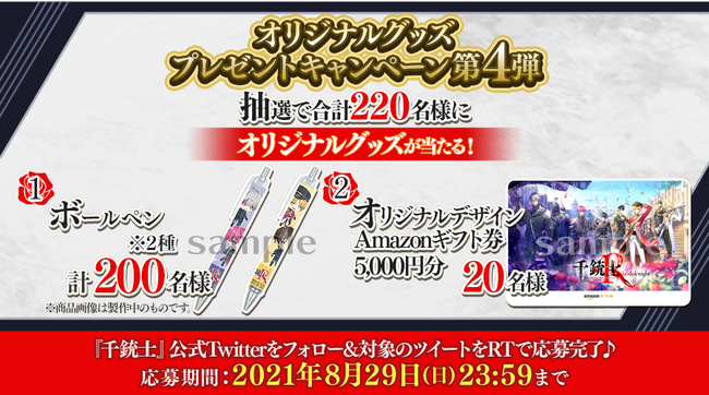 『千銃士』公式Twitterアカウントにて、カサリステ(マークス/ライク・ツー/ジョージ/十手)のミニキャライラストを使用した「ボールペン」やキービジュアルを全面に配した「オリジナルデザインAmazonギフト券 5,000円分」が当たるフォロー&リツイートキャンペーンを開催しております。応募の締切は2021年8月29日(日)23:59まで!奮ってご応募くださいませ!