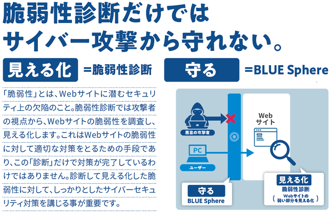 Webサイトを守るためには、サイバー攻撃から守るための「WAF」(BLUE Sphere)と、Webサイトの弱い部分を可視化する「脆弱性診断」の2つが非常に重要です!