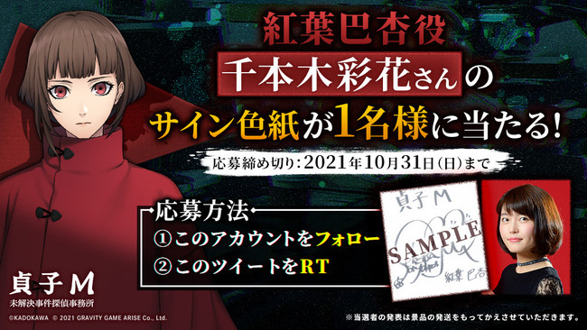謎解きホラーアドベンチャー「貞子M 未解決事件探偵事務所」CV決定を記念した5日連続サイン色紙プレゼントキャンペーンがスタート。第一弾は千本木 彩花さん(紅葉 巴杏役)!
