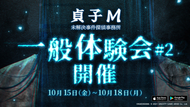 グラビティゲームアライズ株式会社(所在地:東京都中央区)は、現在事前登録期間中のスマートフォン・タブレット向け謎解きホラー脱出アドベンチャー「貞子M 未解決事件探偵事務所」において、本日2021年10月15日(金)より一般体験会#2を開始いたしました。また、開催を記念して、貞子M公式Twitterにて3万円分のAmazonギフト券が3名様に当たる「フォロー&RTキャンペーン」を実施いたします。