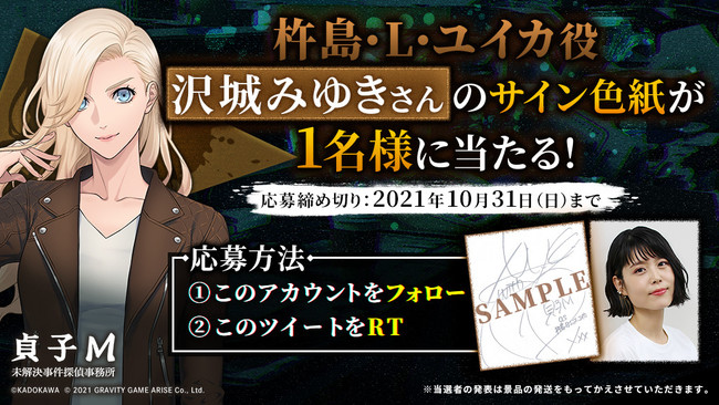 グラビティゲームアライズ株式会社(所在地:東京都中央区)は、この秋リリースするスマートフォン・タブレット向け謎解きホラーアドベンチャーゲーム「貞子M 未解決事件探偵事務所」において、CV(キャラクターボイス)決定を記念した5日連続サイン色紙プレゼントキャンペーンを実施中です。いよいよ最後の第五弾は、杵島・L・ユイカ役の 沢城 みゆきさんです。