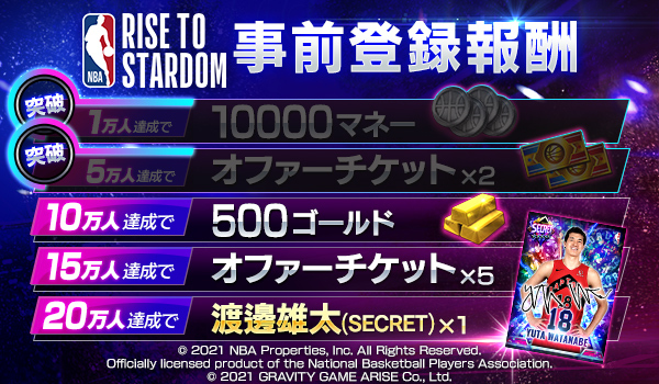 グラビティゲームアライズ株式会社(所在地:東京都中央区)は、今秋リリース予定のNBA公式オンラインシミュレーションゲーム『NBA RISE TO STARDOM』において、事前登録者数が5万人を突破いたしました。また、対象動画の視聴数に応じてゲーム内アイテムをプレゼントする「オリジナル番組配信記念キャンペーン」も開始いたしました。