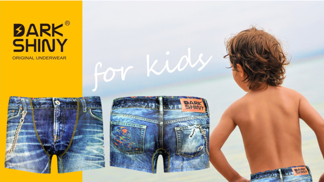 DARK SHINY(ダークシャイニー)のデニムデザインボクサーパンツはリアルなプリントが特徴で、「部屋着としても身に着けられる」というお声も多く、メンズはもちろんレディースタイプでも大人気。この度、キッズサイズを要望するお声にお応えして、キッズ向けのデニムデザインボクサーパンツを販売開始いたします。新年に向けて下着を買い替えるこれからのシーズン、クリスマスのギフトとしてもおすすめです。