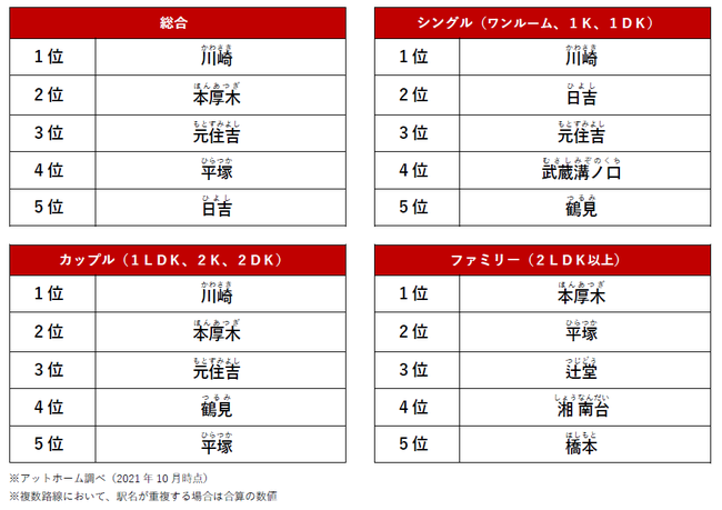 総合・シングル・カップル1位 「川崎(かわさき)」駅、ファミリー1位 「本厚木(ほんあつぎ)」駅