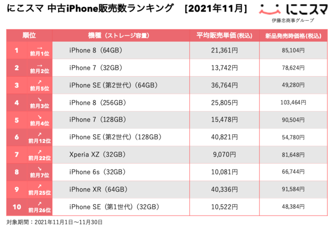 にこスマ|2021年11月中古iPhone販売数ランキング