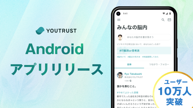 信頼でつながる 日本のキャリアSNS「YOUTRUST」を運営する株式会社YOUTRUST(本社:東京都渋谷区、代表取締役CEO:岩崎由夏)は、新たにAndroid版アプリをリリースいたしました。同時に、累計登録ユーザー数が10万人を突破したこともお知らせいたします。Web・iOSアプリ版でYOUTRUSTを利用いただいていた10万人のユーザーの皆様に改めて感謝をお伝えするとともに、Android版のリリースによりYOUTRUSTを通じてキャリアの可能性を広げられる方を一層増やしていけるよう、今後もサービス向上に努めてまいります。