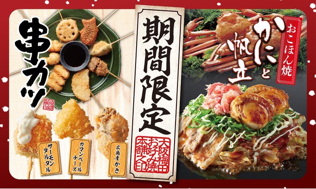 株式会社物語コーポレーション(本社:愛知県豊橋市/代表取締役社長:加藤 央之)は、全国27店舗展開中の『お好み焼本舗』にて、2021年12月7日(火)より、「おこほん焼 かにと帆立」「串カツ 広島産かき」をはじめ、本格鉄板メニューや串カツなどを期間限定で販売いたします。