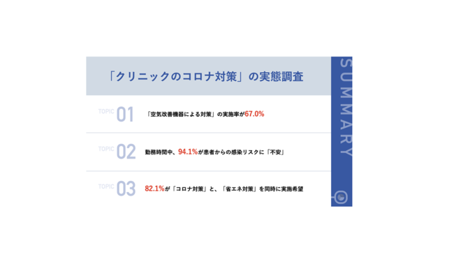一方で、勤務時間中、94.1%が患者からの感染リスクに「不安を感じる」と回答がありました。クリニックということで厳重な対策はされているものの、コロナ患者に接触する機会の多さから、実際に働いている医療従事者の不安を拭いきれていないという状況が明らかになりました。そして、約7割が空気質を数値化するなどの「空気の見える化」で現状の改善に期待しており、換気などの「コロナ対策」とともに「省エネ対策」も実施していきたい意向を示しました。