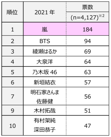 前回、ランク外(9票)だった「BTS」は初のトップ10入りで2位に急上昇しました。前回8位の「綾瀬はるか」は3位に、前回7位の「大泉洋」は4位にそれぞれ順位を上げています。また、7位の「佐藤健」、9位の「木村拓哉」、10位の「深田恭子」が初めてトップ10入りしました。
