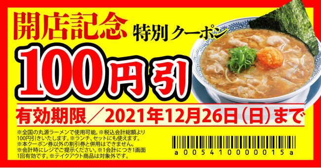 株式会社物語コーポレーション(本社:愛知県豊橋市/代表取締役社長:加藤 央之)が運営する『丸源ラーメン』は、2021年12月17日(金)に、全国174店舗目となる『丸源ラーメン 南大分店』(大分県大分市)をグランドオープンいたします。オープン記念として、2021年12月26日(日)まで全国の『丸源ラーメン』でご利用いただける100円引クーポンを配布します。