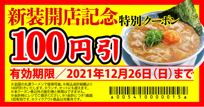 株式会社物語コーポレーション(本社:愛知県豊橋市/代表取締役社長:加藤 央之)が運営する『丸源ラーメン』は、 2021年12月18日(土)に、『丸源ラーメン 知立店』(愛知県知立市)を新装開店いたします。オープン記念として、2021年12月26日(日)まで全国の『丸源ラーメン』でご利用いただける100円引クーポンを配布します。
