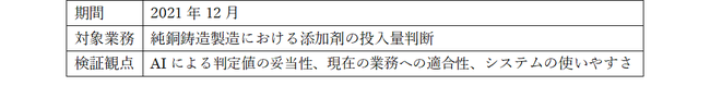 本実証実験では、このAIの判定精度を向上させるだけでなく、予測時間が実用に足るか、また製造の現場技術者が利用するシステムとして操作性に問題はないかなど、システム全体としての業務適用可否を検証いたします。