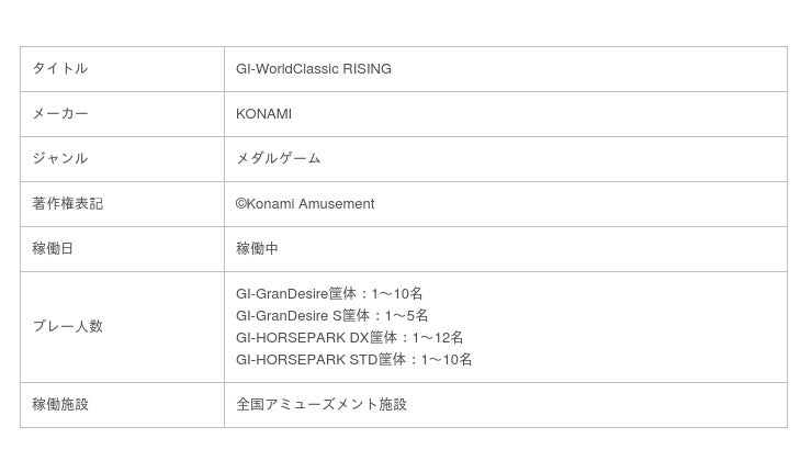 株式会社コナミアミューズメントは、競馬メダルゲーム『GI-WorldClassic RISING(ジーワンワールドクラシック ライジング)』にて「GI-WorldClassic RISING稼働記念キャンペーン」を、本日から開始したことをお知らせします。