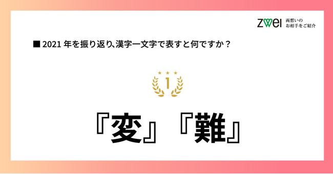 婚活中男女が選んだ2021年の漢字一文字は「変」と「難」が同率1位となった。