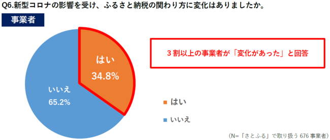・ コロナ禍以降のふるさと納税との関わり方について、34.8%の事業者が「変化があった」と回答。