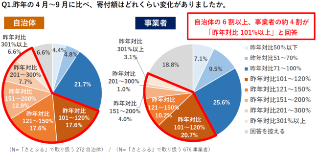 1.自治体の6割以上、事業者の約4割が寄付額の変化を「昨年対比101%以上」と回答(p2:Q1)