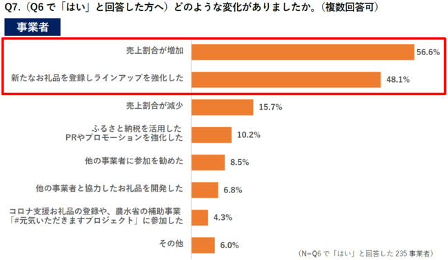 ・ 具体的な変化として、「ふるさと納税の売上割合が増加(56.6%)」「新たなお礼品を登録しラインアップを強化した(48.1%)」といった回答が続き、コロナ禍において事業者がふるさと納税を有効な販路として活用していることが伺えます。
