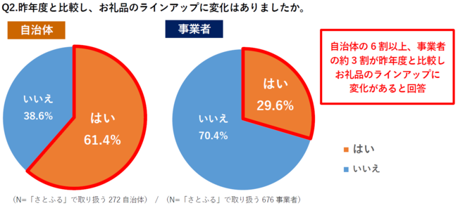 2.自治体の6割以上、事業者の約3割が昨年度と比較しお礼品のラインアップに変化があると回答。コロナ禍2年目における巣ごもり消費への対応や積極的なお礼品開拓・商品開発に取り組む(p2~3:Q2, Q3)