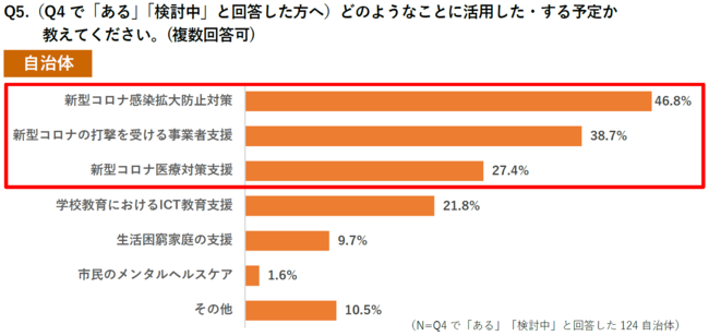 ・ 寄付金の活用実績・予定については、「新型コロナ感染拡大防止対策(46.8%)」「新型コロナの打撃を受ける事業者支援(38.7%)」「新型コロナ医療対策支援(27.4%)」と続きました。