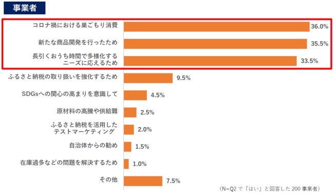 ・ お礼品ラインアップを変えた目的としては、自治体・事業者共に「コロナ禍における巣ごもり消費(自治体:16.2%/事業者:36.0%)」「長引くおうち時間で多様化するニーズに応えるため(自治体:16.2%/事業者:33.5%)」が上位回答に。また、自治体は「事業者開拓・お礼品開拓を強化したため(77.8%)」、事業者は「新たな商品開発を行ったため(35.5%)」が多くの回答を集め、コロナ禍2年目において、巣ごもり消費ニーズへの対応や、新たなお礼品開拓・商品開発に取り組む姿勢が見られました。