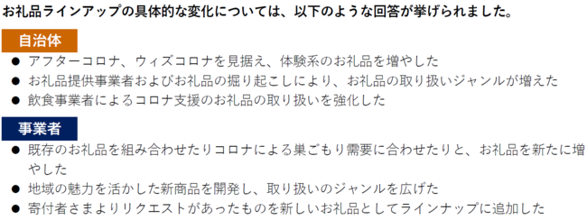 ・ 昨年度と比較したお礼品ラインアップの変化について尋ねる設問では、自治体の61.4%、事業者の29.6%が「変化がある」と回答。具体的には、「アフターコロナ、ウィズコロナを見据え、体験系のお礼品を増やした」「お礼品の取り扱いジャンルを増やした」などの回答がありました。