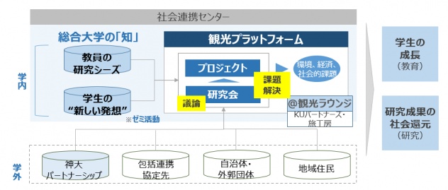 このプラットフォーム事業では、研究会での議論に加え、産官学民連携プロジェクトで課題解決をはかる実践型の事業として、新たな教育・研究の展開が期待されています。特徴の一つとして、プラットフォーム事業を産業界から推進する「神大パートナーシップ制度」が創設され、ソラボは今回パートナーとして参画することになりました。既にプログラムの第一弾として、協創空間“観光ラウンジ”を中心に、「観光」に関する環境、 経済及び社会的課題の解決に取り組む「観光プラットフォーム」が開始されています。