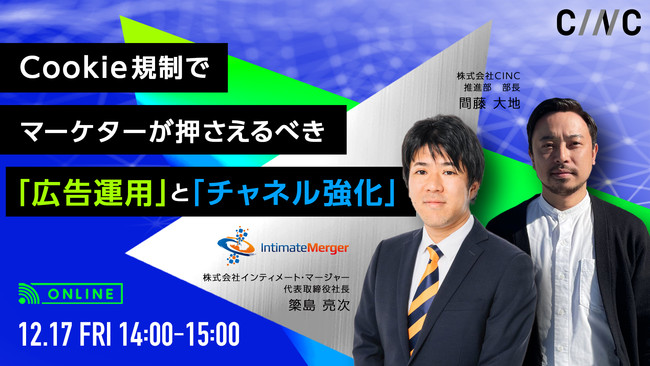 株式会社CINC(シンク、以下CINC)は、2021年12月17日(金)に株式会社インティメート・マージャー株式会社とオンラインセミナー「Cookie規制でマーケターが押さえるべき「広告運用」と「チャネル強化」」を開催いたします。