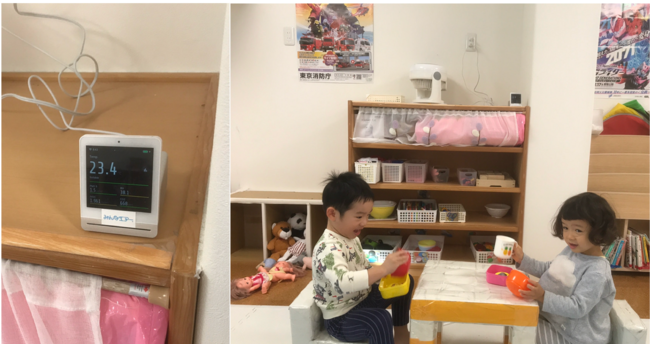 そこで、「空気の見える化」を通じて安心できる場所を増やす、エアテック事業『みんなエアー』のMADO(空気質計測器 https://minnaair.com/mado/)を活用した空気質モニタリングを行うことにより、施設内の空気環境がどのような状態であるかを把握し、必要があれば改善対策を検討するとともに、空気の状態や施設内での取り組みを職員・園児・保護者等の関係者に「見える化」することがそれぞれのコミュニケーションにどのような影響を与えるか、観察・検証いたします。