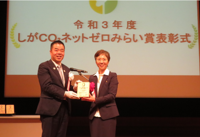 滋賀県では、2050年までに滋賀県内で温室効果ガス排出量を実質ゼロにすることを目指し、2020年1月に、県民や事業者等様々な主体と連携して取り組む「しがCO2ネットゼロムーブメント」キックオフ宣言が行われました。これに伴い、滋賀県内において“CO2ネットゼロ”の推進に関する特に優れた取り組みを行った県民、事業者および民間団体を表彰する「しがCO2ネットゼロみらい賞」が今年度から新たに創設されました。「先進導入・実践部門」は、事業活動において先進的な設備の導入や創意工夫を凝らした省エネの実践等により、CO2の排出量を削減する取り組みを行っている中小企業を含む事業所へ贈られました。