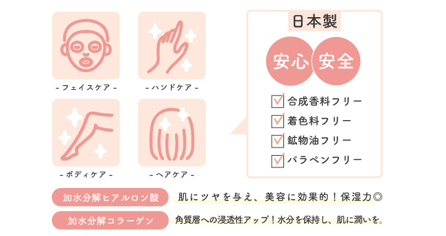 オールインワンジェルは安心・安全の日本製で加水分解ヒアルロン酸と加水分解コラーゲン配合!