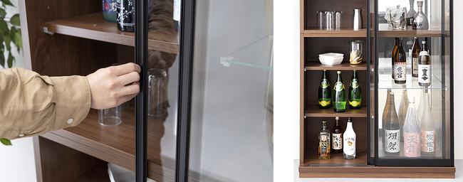 また左右をL字型耐震ダボでガラス棚板の設置することにより、地震などの万が一の時にも安心の仕様となっております。