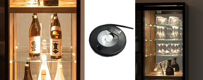 このコレクションケースは、上下の2段構造になっており、向かって右側の各天井部に、LEDダウンライトを取り付けています。ガラス棚板と背面部の鏡によって、コレクションを優しく美しい光で照らします。