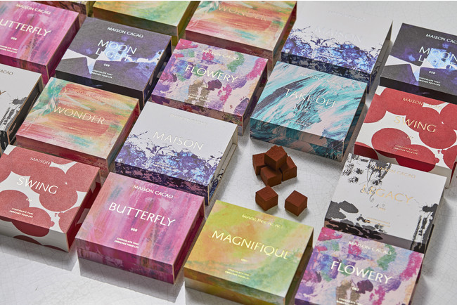 11種それぞれを、フレーバー、アート、詩、音楽で一つの心の感情と新体験として表現しています。フレーバーはメゾンカカオのディレクター石原紳伍が、パッケージのアートは書家の中塚翠涛氏が、詩は大岡陽子氏が、音楽はマヤ・ムガ・モーラン氏がそれぞれの感性とクリエイティブを掛け合わせ、11種の異なる世界観を創り上げています。
