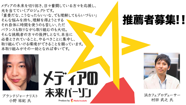 メディアの未来を追いかけ続けるメディア「メディアインキュベート」では、『メディアの未来プロジェクト』『メディアの未来パーソン』の推薦をお待ちしております。「光のあたっていないものに光を」というコンセプトも持っており、日々努力し、懸命に状況を打破されようとしている方々の応援をしたいという思いもあります。ぜひお気軽にご連絡いただけたら幸いです。