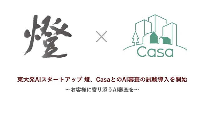 東京大学発AIスタートアップ燈株式会社(本社所在地:東京都文京区本郷、代表取締役社長:野呂 侑希、以下「燈」)は、株式会社Casa(本社:東京都新宿区西新宿、代表取締役社長:宮地 正剛、以下「Casa」)と連携し、家賃保証審査におけるAI審査の試験導入を開始したことをお知らせいたします。これまでCasaのお客様の視点に立って開発しておりました審査AIの精度や効果を測定・改善を行なって参ります。