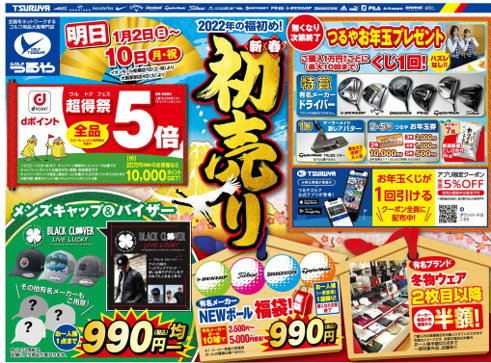 製造から販売まで一括して手掛け、お客様のゴルフライフを全面サポートするゴルフ総合プロデュース企業を目指す、つるや株式会社(本社:大阪府大阪市中央区、代表取締役社長:西村理作)は、2022年1月2日(日)~10日(月・祝)にて、ご購入商品全品にdポイントを5倍付与し、さらには有名メーカーのドライバーやゴルフウェアなど様々なゴルフアイテムが通常時よりお得にご購入いただける「新春初売り」を開催いたします。