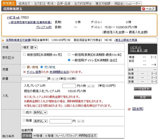 ・一般信用取引(デイトレ信用)のプレミアム料は、入札申込受付時間内に、最高金額にて入札されたお客さまのみが落札となり、注文受付時間内に発注が可能となります。デイトレ信用プレミアム料入札(オークション)方式の詳細は当社ホームページにてご確認ください。