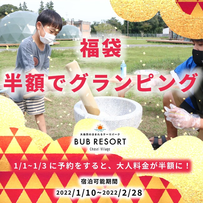 株式会社BUB(東京都品川区、代表取締役 一戸 悠人)が運営するBUB RESORT Chosei Village(千葉県長生郡)で元旦の朝から三日間限定で、料金が半額(子供料金除く)となる福袋プランを販売いたします。2022年1月1日~3日の期間中に、対象期間(1月10日~2月28日)のご予約いただいた方が対象となります。