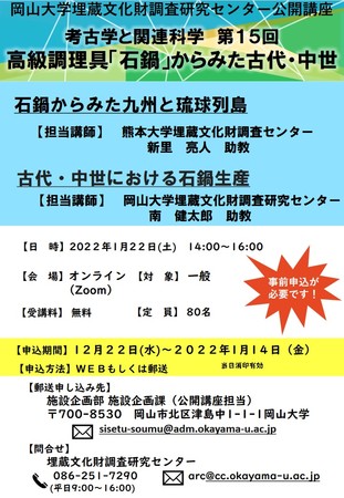 【岡山大学】岡山大学埋蔵文化財調査研究センター公開講座・考古学と関連科学~第15回 高級調理具「石鍋」からみた古代・中世~〔1/22,土,オンライン〕