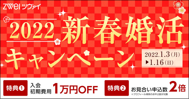 全国に業界最多の50店舗を展開する結婚相談所ツヴァイ(運営会社:株式会社ZWEI、代表取締役:中本 哲宏)は、2022年に婚活をスタートされる方を応援する“新春婚活キャンペーン”を開催いたします。2022年1月3日(月)~1月16日(日)の期間中にツヴァイ(https://www.zwei.com/)でご入会いただくと、初期費用「10,000円(税込)OFF」・プロフィール検索のお申込数「2倍」となります!