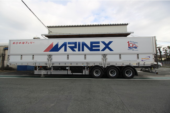 新日本海フェリー(舞鶴-小樽、敦賀-苫小牧東、新潟-小樽、敦賀-新潟-秋田-苫小牧東)や東京九州フェリー(横須賀-新門司)などSHKライングループの貨物利用運送業を担うマリネックス株式会社(大阪市北区)は、日本トレクス株式会社に発注した最新鋭の冷凍ウイングセミトレーラを導入、通算100台に達成したことを発表しました。