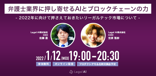 「AIとテクノロジーにより司法トラブルを解決」をミッションにAIを活用した司法手続き支援サービスを開発するリーガルテックスタートアップ、Legal AI株式会社(リーガルアイ株式会社、 本社:東京都、代表取締役:佐藤塁)はリーガルテックの活用と技術展望についてのセミナーを2021年1月12日(水)に開催します。弁護士が抱える現状の課題や国内外の事例、そしてブロックチェーンやNFTなどの最新技術の応用について紹介をし、2022年に押さえておきたいリーガルテックについての概況や今後のトレンドを掴むことができるセミナーになります。