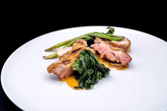 通常の鶏肉よりも弾力のある薩摩シャモを、皮は香ばしくグリエにして、地鶏の炭火焼のようなイメージで仕上げました。