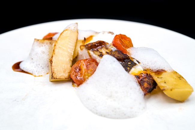 表面はカリッと、中はふっくらと焼き上げた真鯛に、ホワイトマッシュルームの香りをつけた泡のソースと、ベーコンの旨味を出した濃厚なソース、2種のソースで仕上げております。