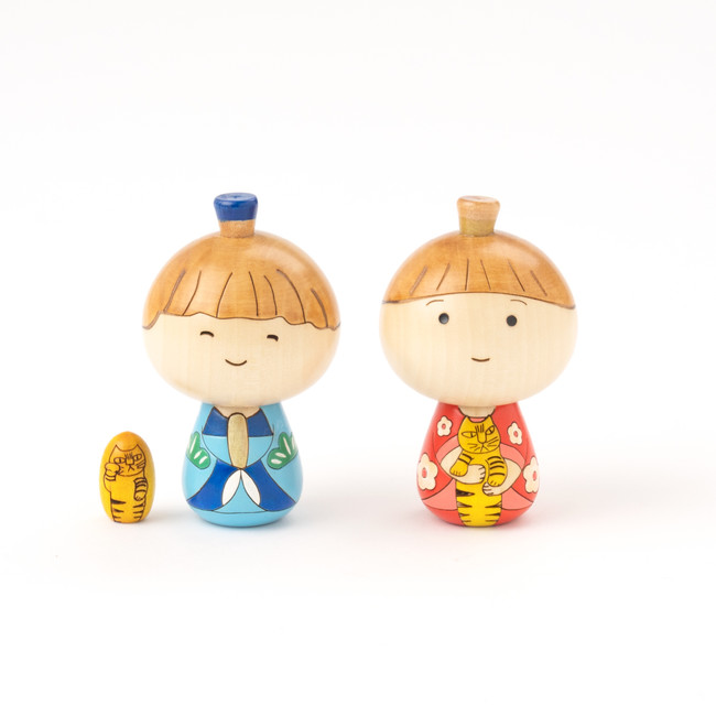 ペレの元となったのは、1964年~1980年に作られたリサのオリジナル作品「ラーソン家の子どもたちシリーズ」のペレ(ペッレ)。そして、スティナの元となったのは、同じくリサのオリジナル作品「ねこを抱くスティーナ」。スティナは1957年に試作としてリサのアトリエで作られ、翌年には早くも製品化が実現した作品でした。オリジナル作品の朗らかな印象はそのままに、お内裏様(おだいりさま)とお雛様(おひなさま)になったペレとスティナ。桃の節句に合わせて、ひとつ成長した姿を見せてくれています。今回の作品も、これまでにリサのこけしをいくつも手掛けてきた群馬県の創作こけし工房と一緒に作りました。リサの原型を元に、こけし職人さん自身がデザイナーとなって作品をこけし向けに作り直す、というところから始まるなんとも奥深いこけし作り。手作りならではの木のぬくもりと細かな装飾の煌びやかさを同時にお楽しみいただける、お祝いにぴったりのとっておきが完成しました。