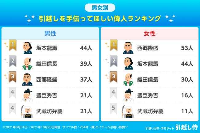 【2022年最新版】引越し侍が、「引越しを手伝ってほしい偉人ランキング」を公開!