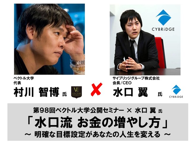 IT を活用したファッション古着の買取や販売を手掛ける株式会社ベクトル(本社:岡山県岡山市、代表取締役:村川智博)は、2022年1月20日(木)にサイブリッジグループ株式会社 会長/CEO 水口 翼 氏をお迎えし、第98回一般公開型フォーラム「ベクトル大学」を開催します。今回は「お金の増やし方」をテーマに、投資家としても有名な起業家水口翼氏とベクトル大学代表村川がトークを繰り広げます。2022年4月からは高校家庭科でお金に関する授業がスタートします。金融リテラシーを高めたい方や投資に興味のある方に必見の内容となっております。会場受講(有料)とオンライン(無料)どちらでも参加できますので、お気軽にお申込みください。
