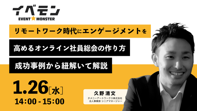 タメニー株式会社(本社:東京都品川区、代表取締役社長:佐藤茂、証券コード:東証マザーズ6181)のグループ会社であるタメニーアートワークス株式会社(代表取締役社長:福井秀幸)が運営する企業イベントプロデュース「イベモン(URL:https://evemon.jp/、以下「イベモン」)」は、「リモートワーク時代にエンゲージメントを高めるオンライン社員総会の作り方」をテーマとした無料ウェビナーを1月26日(水)に開催いたしますのでお知らせいたします。